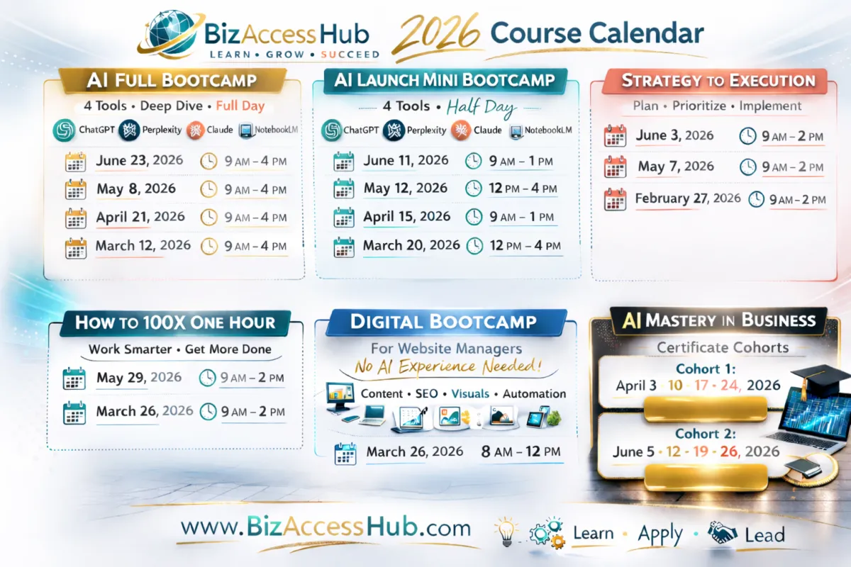 At BizAccessHub, we empower business leaders with the skills, tools, and confidence to harness AI and automation for real results. Whether you’re looking to boost productivity, streamline operations, increase profitability, or unlock new growth opportunities, our programs provide the hands-on experience and personalized guidance you need to succeed.